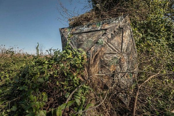 With a 59×59-inch footprint, an interior height of 66-inches, and a shooting width of 66-inches, the Care Taker Magnum is big enough for two bowhunters to both draw and shoot accurately without fear of a rear or side wall getting in the way, or three hunters waiting comfortably for the action to begin. The size also makes filming with a buddy easy, as well. Mossy Oak Break-Up Country camo covers the entire blind and shoot-through mesh windows. Inside, a black ShadowGuard™ coating ensures shadows and silhouettes won’t give you away. Other features include a Durashell™ Plus fabric shell with a matte finish, rugged Spider Hub® frame for easy set-up and takedown, Silent Toggle triangular window system, brush-in loops for adding natural foliage, and an easy-access zippered door that’s both quiet to operate and large enough for easy, silent access.