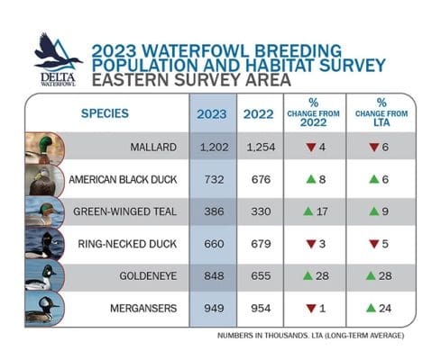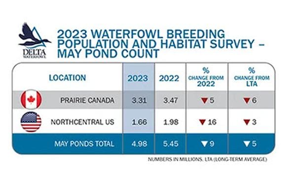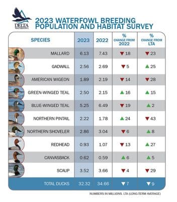 Those numbers resulted from the Waterfowl Breeding Population and Habitat Survey, which has been conducted annually by the USFWS and Canadian Wildlife Service since 1955, except for 2020 and 2021 because of COVID-19 concerns. The survey, which is used to set hunting regulations throughout North America, estimated a breeding duck population of 32.3 million ducks in the traditional survey area, which is 7% less than 2022 and 9% below the long-term average. Importantly, the May pond count, a key indicator of duck habitat and potential production, showed 4.98 million ponds, a 9% decrease and 5% below the long-term average.