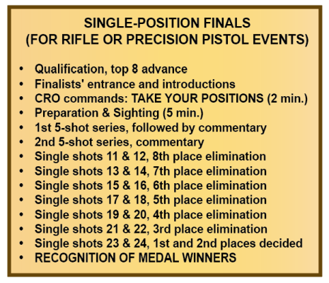 FINALS COMPETITION STRUCTURE. A first step in preparing to shoot a final is to learn the basic rules that govern how they are conducted. The charts on page 9 list the step-by-step actions that occur during the two types of finals. Finals begin with athlete introductions that are followed by a preparation & sighting time. Record firing of 5-shot series follows. After each record series or shot the CRO commands STOP, and the Announcer gives brief commentary about who is leading and the scores just fired. Finals end with single shots, after which the lowest ranking athletes are eliminated. Finals end with the two leading athletes firing a last single shot to decide the gold and silver medal winners.