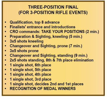 2. Know Finals Rules. Most key finals rules are incorporated into the bullet point charts to the right. Master the procedures in the appropriate chart. A couple of key rules are worth noting a) Do not load until the LOAD command is given (loading includes placing a cartridge or pellet in contact with the rifle or pistol) and b) In three-position finals, don’t start changeovers until the CRO announces them and gives the START command. Note: If you are a pistol athlete, the 10m Air Pistol Final is essentially the same as a Single Position Final. The 25m Pistol Final consists of a succession of 5-shot rapid-fire series (pistol down 7 seconds, up 3 seconds for each shot).