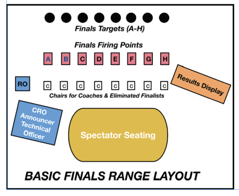 FINALS RANGE FEATURES. Finals in international competitions usually take place in dedicated finals ranges with lots of spectator seating. They are designed to be theaters where television productions take place. The ranges where juniors can expect to shoot finals will be regular 10-meter or 50-foot ranges that are temporarily set up to conduct finals. Eight firing points are designated as finals firing points by using the letters A through H. Chairs are placed behind each final point where coaches can sit and where eliminated finalists can take their seats. There will be a table or Range Officer stand where the Target Technical Officer, Chief Range Officer and Announcer sit. Whenever possible, seating for spectators is provided. If the range has a display panel, it should be placed so spectators can see it.