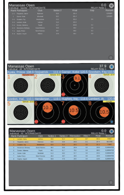 Most of these ranges also have LCD panels or projection systems attached to the computer that controls targets. The display system should make it possible for spectators, to watch finals. Results display software supplied with electronic target installations allows them to display finalist names, shots, scores and status (The illustration on the following page shows what spectators would see during a final conducted with Orion software).