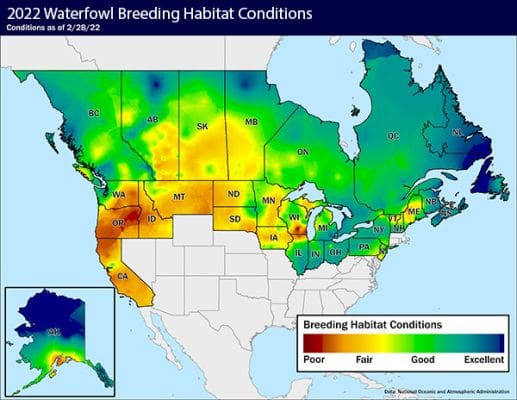 Mike Buxton, waterfowl programs manager for Delta Waterfowl, gathers hydrologic and weather station data and compiles it into Delta’s Waterfowl Breeding Habitat Conditions Map.” The Feb. 28, 2022, map shows outstanding improvement over what looked to be dire habitat conditions going into the winter.