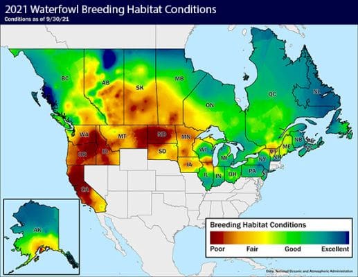 “Things are looking good on the prairies, especially when you get up into Canada,” Buxton said. “It’s been a snowy winter in Saskatchewan and Manitoba. In fact, at least until mid-February, Winnipeg was reporting its third-snowiest winter on record. Big snowfalls in Saskatchewan and Manitoba, combined with winds that drifted the snow right into the wetlands where it is most beneficial, mean good conditions when the melt begins.”