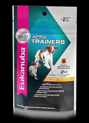 - ACTIVTRAINERS are soft, easily digestible treats that contain DHA to help support healthy brain function. They contain less than two Calories which helps owners maintain ideal weight while training regularly. The 5-ounce bag is available in two options, with either chicken or salmon as the first ingredient ($6.99) while the 7.9 ounce bag with chicken as the first ingredient ($9.99). For both adult dogs and puppies two months and older.