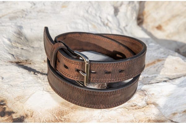 The extremely durable belt is made with premium water buffalo leather, giving the belt a sturdy and long-lasting build. The Double Ply Leather Carry Belt is designed to look great with distressed brown color, edge dressed, and double stitched styling.