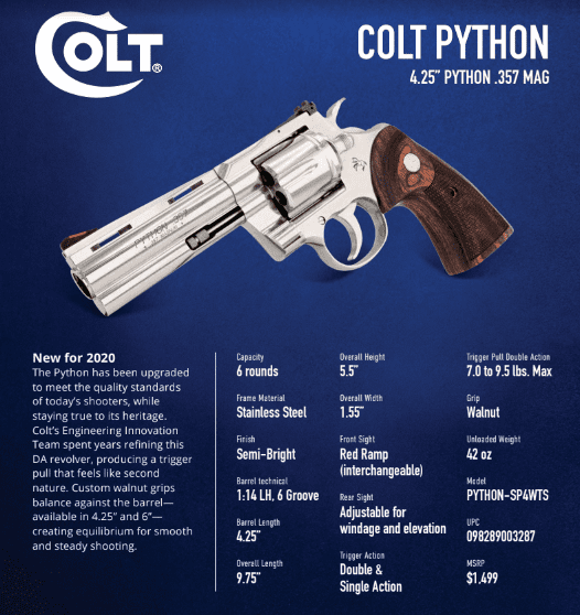 WEST HARTFORD, CONN., (January 1, 2020) – After years of research and development, Colt releases a refined and upgraded Colt Python. The legendary double-action revolver, which originally debuted in 1955, returns in stainless steel in 4.25” and 6” barrel lengths.