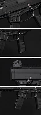 A slimmed-down upper receiver accommodates more options when attaching different accessories to replace the end cap. A redesigned magwell is resized, adding more purchase on the handguard for large or gloved hands. The adjustable four aperture aluminum sights are updated to deliver lower 1/3 co-witness with popular red dots, providing a better sight picture and reliable backup.