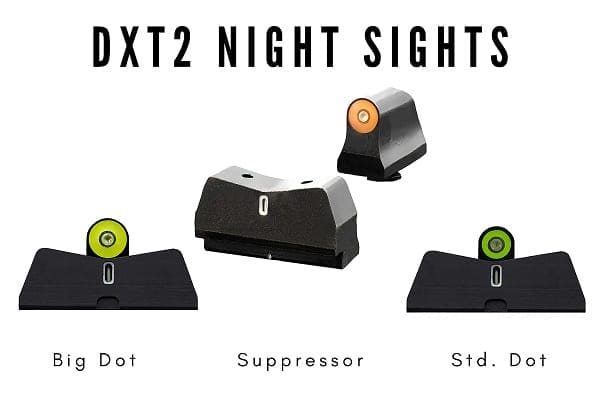 The DXT2 Night Sights have tritium in the rear, which provides the brightest indexing point for sight alignment in low light. The DXW2 Night Sights have a white-stripe rear, which reflects light to offer an excellent, bright-light sight picture and provides more affordability for the set.